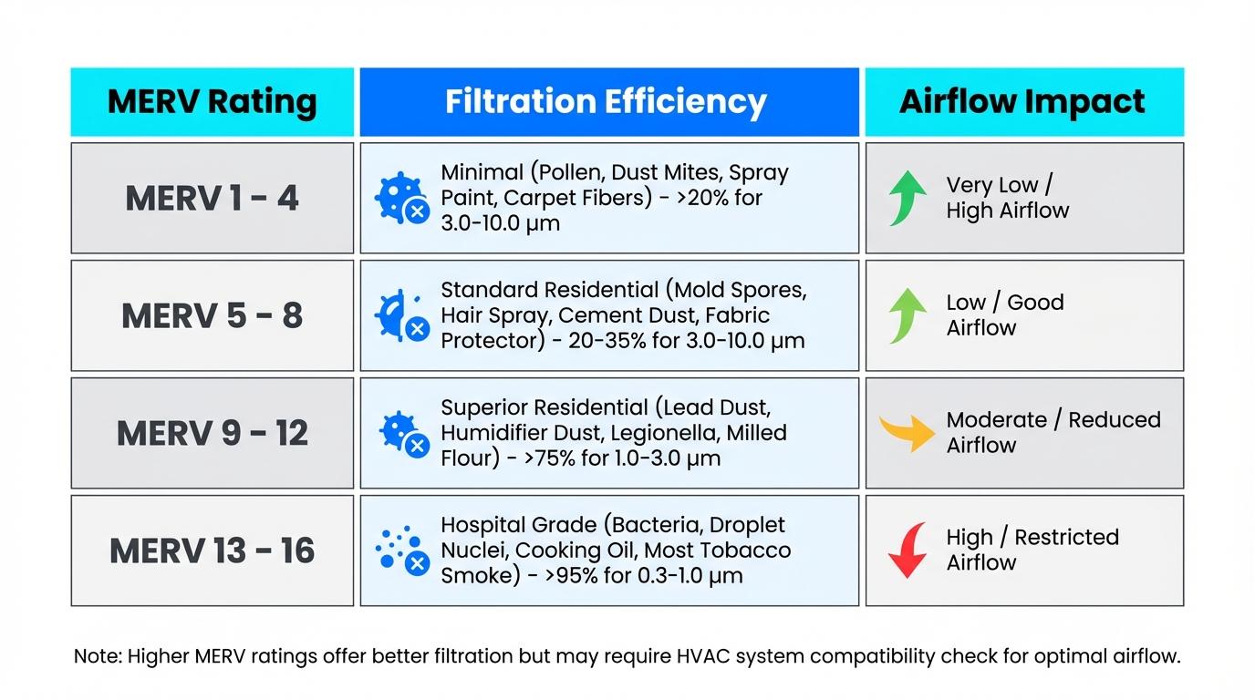 | MERV Rating | Filtration Level | Common Contaminants Captured | Airflow Impact |